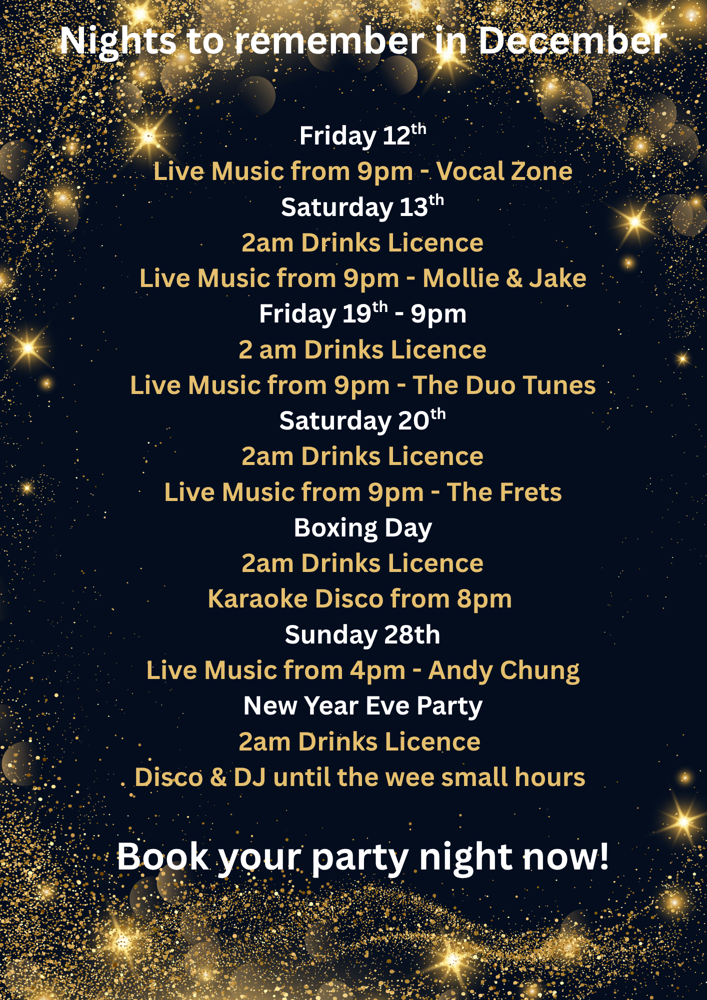 We only close on Christmas Day to allow everyone to enjoy Christmas with their families, although the kitchen closes at 8pm Christmas Eve, Boxing day & New Years Eve.